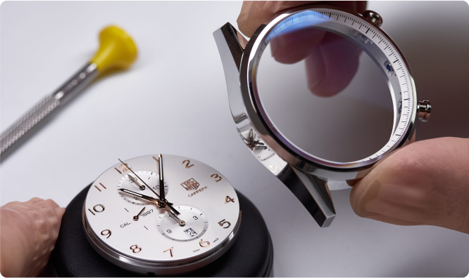 Проведем установку или замену стекла, заменим циферблат, установим логотип и метки, установим стрелки и проведем их синхронизацию. Проверим часы на герметичность. Заменим механизм.